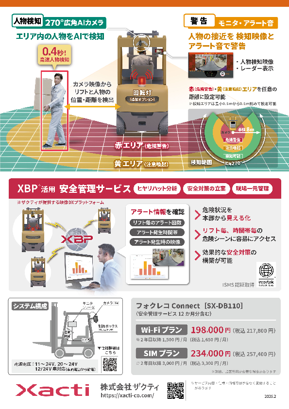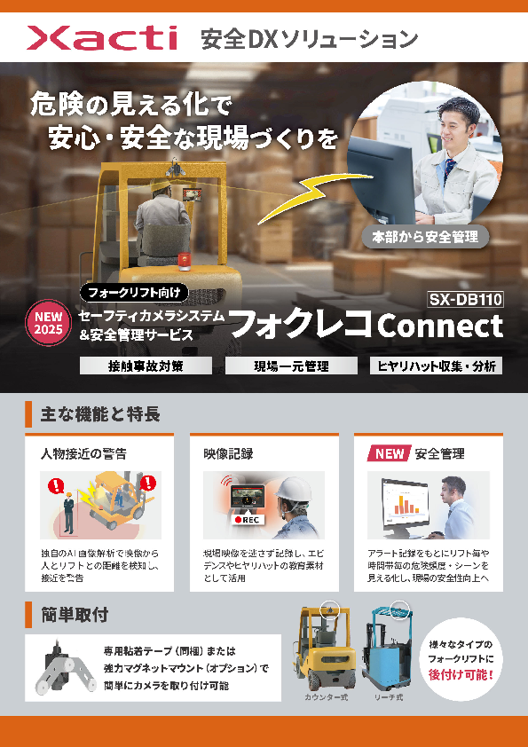 フォークリフト用セーフティカメラシステム「フォクレコ ″SX-DB100/DB110″」は、独自のAI人物検知技術を搭載し、既存のフォークリフトにも取り付け可能な柔軟性を持つ安全対策ソリューションです。人物の接近をリアルタイムで検知し、映像やアラート音、警告灯を通じて即座に危険を周知します。また、このシステムと連携する「安全管理サービス(フォクレコConnect)」は、ネットワーク経由で現場のアラート状況を本部へ集約し、アラートの数値化と状況の見える化をするソリューションです。検知されたアラート回数や発生時間帯、発生時の映像をもとに危険の発生傾向を分析でき、重点的に対策を講じるべきポイントが効率的に把握できます。