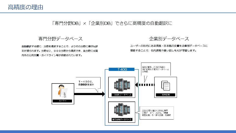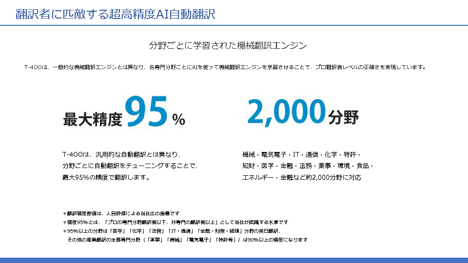 精度95%はプロの翻訳者様に匹敵するレベルです。2,000分野の専門分野データベースが搭載されているため、翻訳が難しい専門用語も適切に翻訳してくれます。AI自動翻訳を全社導入いただく企業が増えてますが、翻訳業務を社内スタッフが対応したり、外注に出している企業もまだ多くございます。