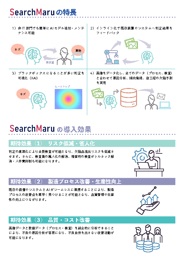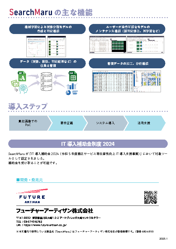 本セミナーでは、FutureArtisanが 提供するAI外観検査ソリューション「SearchMaru」を活用し、効果的なアプローチを実際の事例やデモを通してご紹介します。