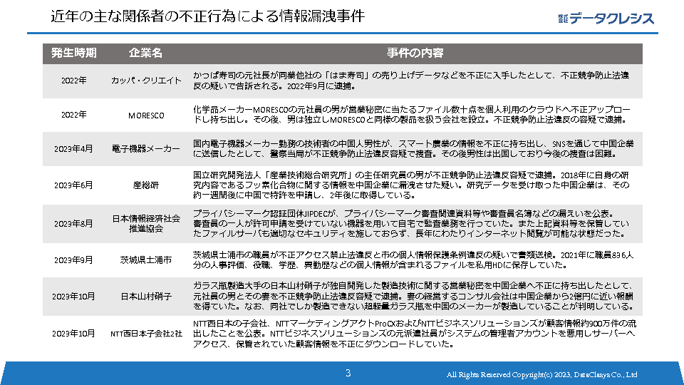 セキュリティ脅威が多様化する中、組織内の内部不正行為に起因する情報流出事件が相次いで発生しています。たとえば、元従業員が不正に何百万人分もの顧客情報を持ち出したり、以前の勤務先の知的財産や機密情報を新し勤務先に持ち込む「手土産転職」行為などが実際に起きています。そうした犯罪行為が横行すると、経済的な損失のみならず自社の社会的な信用が失墜するリスクが非常に高まります。
