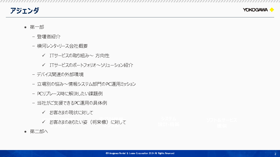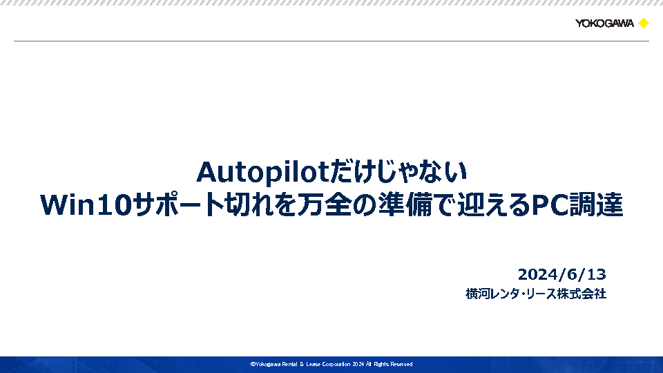 横河レンタ・リースの各種PC運用サービスは、Windows11移行の課題を解決に導きます。当社は、100万台以上のレンタルPC保有し、お客様に提供することで培った運用管理ノウハウを活かし、お客様の業務環境に合わせた最適なPC運用をご提案します。中でも注力するのが、ゼロタッチキッティングの実現です。開梱後、電源を入れるだけでセキュリティ設定や必要なアプリのインストールが完了し、すぐに利用を開始できます。従来、PC納品後に手作業でキッティング行っていた時と比べ、大幅な工数削減が可能です。また、PC運用における様々な作業を当社にアウトソースいただくことで、情シス部門は本来の業務に専念することができます。セミナーでは、ゼロタッチキッティングの仕組みやPC運用のアウトソースサービスを詳しくご紹介します。情シス部門のリソース不足や多様な業務にお悩みの方は、ぜひご参加ください。