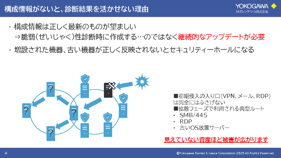 しかし、日常業務に支障がないため運用やセキュリティ対応の優先度が下がり、構成情報の更新漏れやパッチ適用の遅れが生じることがあります。