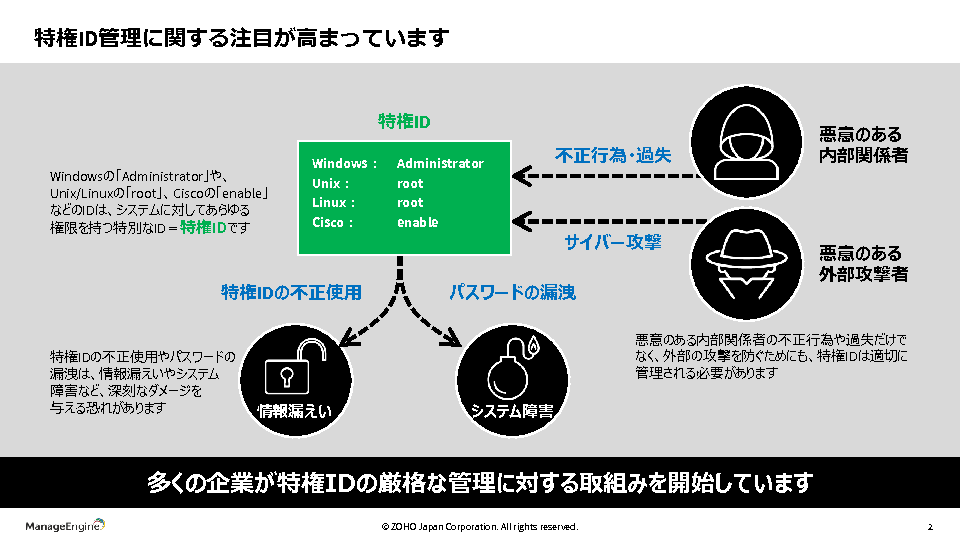 一般ユーザーIDではできない高度な操作が可能な特権IDが不正に使用された場合、情報漏洩、改ざん、システム変更、システム障害、重要なデータの削除、サーバー攻撃の拠点に利用されるなど、企業にとって致命的な損害が発生します。