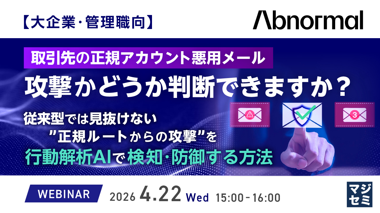 【大企業・管理職向】取引先の正規アカウント悪用メール、攻撃かどうか判断できますか? ~従来型では見抜けない”正規ルートからの攻撃”を、行動解析AIで検知・防御する方法~お申し込み