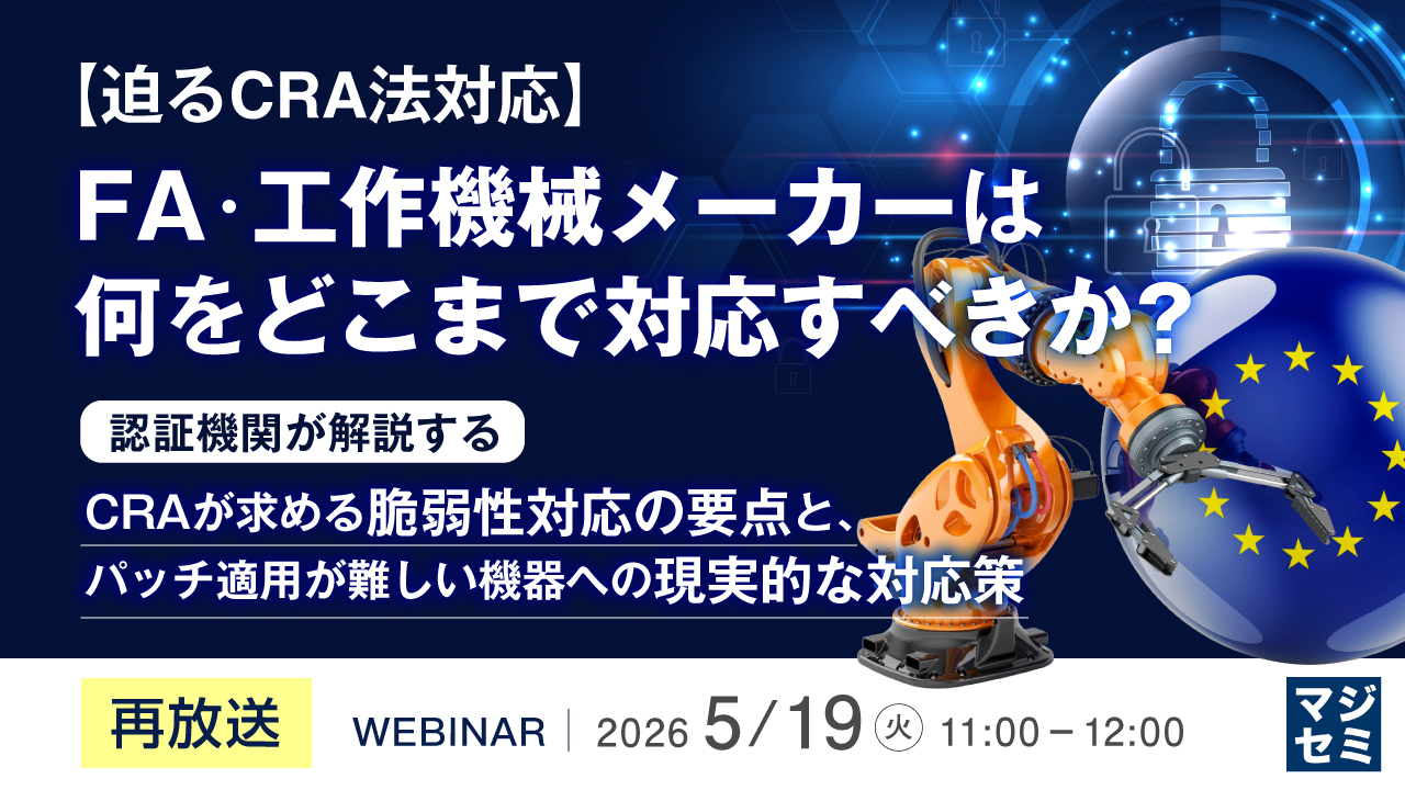 【再放送】<迫るCRA法対応>FA・工作機械メーカーは何をどこまで対応すべきか? ~認証機関が解説するCRAが求める脆弱性対応の要点と、パッチ適用が難しい機器への現実的な対応策~お申し込み