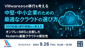 本セミナーでは、VMwareからの移行を検討している中堅・中小企業様を対象に、移行から管理運用まで一貫サポートするNutanix基盤のプライベートクラウド『Clara Cloud』を通して、オンプレミス環境やAWSと比較しながら、運用の簡素化、スケーラビリティ、コスト効率などについて詳しく解説いたします。