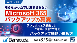 実際、Microsoft 365ユーザーの中には、データ復旧に失敗したトラブルも発生しています。たとえば、退職者のアカウント削除後に重要データが完全に消失していたケースや、ランサムウェア感染後にOneDrive内のファイルが暗号化され、復元できなかった事例もあります。Microsoft 365のバックアップに関する誤解に起因するケースが多く、正しく理解した上で適切な対応策が求められます。 本セミナーでは、実際に起きた復旧失敗の例をもとに、Microsoft 365環境におけるバックアップの重要性を解説します。また、Microsoft 365のバックアップ対策の最適解として「Barracuda Cloud-to-Cloud Backup」をご提案。個別ファイル・フォルダ単位でのリストアや、Entra IDの保護、容量無制限、ランサムウェアスキャン機能など、ランサムウェア対策にも役立つより柔軟で確実なバックアップ運用を支援できる特長などを紹介します。 また、Microsoft 365導入支援においてバックアップが後回しにされがちな課題や、追加提案が難しいと感じているリセラー・パートナー企業にとっても、差別化と提案力を高めるヒントが得られる内容となっています。「信頼できる安心・安全なバックアップを実現するには、どうすれば良いのか?」とお悩みの方は、ぜひご参加ください。