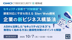 セキュリティ診断は、顧客からの信頼を得る手段であり、競合優位性を高める“新たな武器”として注目されています。しかし、その導入をためらう企業も少なくありません。 本セミナーでは、そうした課題を抱えるSIerやWeb開発・制作企業の方を対象として開催します。GMOサイバーセキュリティbyイエラエが提供する脆弱性診断ツール「GMOサイバー攻撃ネットde診断」を例に、ASMの基本的な仕組みからセキュリティ診断の実践方法やセキュリティビジネスへの展開、採用事例などをご紹介します。診断結果をレポートとして提供するモデルやパッケージに組み込む形など、さまざまな展開が可能です。 「他社との競争優位性を高めるため、セキュリティを付加価値としてつけたい」「顧客の課題や要望に応えることで顧客満足度を高めたい」「簡単にセキュリティ診断を実施したい」という方は、収益と信頼につながる“次の一手”をぜひ本セミナーで見つけてください。