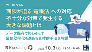 13:05~13:45 期限が迫る電帳法への対応、不十分な対策で発生する大きな課題とは ~データ保存で終わらせず、業務効率化を進める具体的手法を解説~