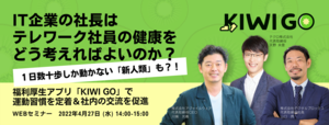 そこで本セミナーでは、デジタルブロックス、テクロ、アジャイルウェアのIT企業3社が、テレワークの健康問題をどう守ればよいのかについて議論します。 また、社員の運動習慣化を目的として作られたアジャイルウェア社のサービス「KIWI GO」の活用によってどんな変化が起きたのかについても語っていきます。 社員が長期的に心身ともに健康で働ける「健康経営」を実現したいIT企業の経営者の方は、ぜひご参加ください。