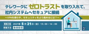 12:45~13:00 受付 13:00~13:05 オープニング 13:05~13:45 テレワークに“ゼロトラスト”を取り入れて、社内システムへセキュアに接続 ~VPNを使わず、セキュリティをより高めるには?~ 13:45~14:00 質疑応答