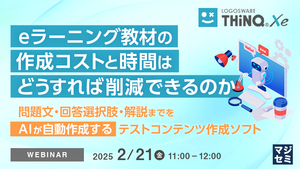 本セミナーでは、このような課題を解決するテストコンテンツ作成ソフト「THiNQ Xe(シンク・クロスィ)」をご紹介します。 THiNQ Xeには下記の特長があり、教材作成の手間やコストの削減・クオリティの向上をサポートします。 ・問題文、回答だけではなく解説までAIで自動作成できる ・詳細な問題作成の指示が行えるため、テーマ(出題範囲)や出題形式・文体など細やかな調整が行える ・SCORM1.2、SCORM2004に対応していますので、対応しているLMSでの運用が可能 また、高性能な最新AIを活用しているため、高品質な問題・回答・解説が作成できる点や、「誤答」の品質もしっかりと考えなければいけないようなレベルで作成できる点を評価いただいています。 eラーニングの教材作成に手間やコストをかけている方、クオリティを向上させたいとお考えの方に特におすすめの内容です。