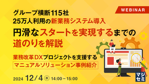 今回のセミナーでは、作成工数を最大96%削減し、導入累計3000社以上の実績をもつ自動マニュアル作成ツール「Dojo」について、マニュアル整備を起点とした業務改革の事例を解説します。 特に次のような課題をお持ちの方におすすめです。 ・DX推進の停滞を打破し、プロジェクトを加速させたい ・頻繁に変わるシステムや業務に柔軟に対応したい ・来年度の新入社員の入社に向けて、早急にマニュアル整備を進めたい