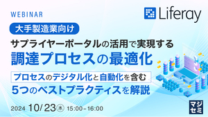 本ウェビナーでは、大手製造業が抱える調達プロセスの課題を解決するLiferayのサプライヤーポータルを解説いたします。 サプライヤーポータルの有効性だけではなく、コミュニケーションや連携の一元化や、プロセスのデジタル化と自動化などの、 5つのベストプラクティスを詳しく解説いたします。 ウェビナーの中では、グローバルに展開する企業での実際の導入事例もご紹介し、各企業がどのような課題を持ち、Liferayによりどのような成果を出しているのかを解説します。 大手製造業において調達プロセスの課題をお持ちの方や、サービスをご提案する立場の方に特におすすめの内容です。