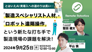 今回のウェビナーでは、上記のようなAI活用に課題をお持ちの企業様に対し 矢崎総業が提供する製造現場に精通したスペシャリスト人材が リモートロボティクスが提供するロボットの遠隔操作を実現するサービス「Remolink」を活用し、 製造現場で稼働するロボットに対して指示を行うことでAIでは対応できない高度で柔軟な生産に貢献します。