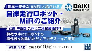 本セミナーでは、このような課題を解決する搬送システムの最新ソリューションとして、大喜産業株式会社が提供する自律走行ロボット『MiR』をご紹介します。『世界一安全なAMR』と称されるこのロボットは、ISO3691-4の安全基準に準拠し、3Dカメラや近接センサーで工場内の人や障害物を回避しながら、環境の変化にも柔軟に対応することが可能です。また、パレット搬送やカート牽引、コンベア搭載、協働ロボットとの連携など、多様な業務に柔軟に適用できるアプリケーションを備えている点も特長です。MiRはプログラミング改修を自社で行うことができ、直感的な操作性を備え導入後の運用コストを抑えることが可能です。 安価なAMRを導入したものの、拡張性に課題があり工場内でAMRの運用が行われていない自動車製造業・半導体製造業の方は是非ご参加ください。本セミナーでは、実際の導入事例や『MiR』の稼働ビデオを通じて、現場での活用方法を具体的にご確認いただけます。特に西日本のお客様には、実際に自律走行ロボット『MiR』の動作を御覧いただける見学会もご案内いたします。