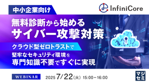 本セミナーでは、ランサムウェアやVPNの脆弱性、クラウド活用時のセキュリティ不備といった現実的な脅威を分かりやすく解説します。加えて、クラウド型ゼロトラストセキュリティ「InfiniProtect」を活用し、面倒な運用負担なしで全通信を保護する実践的なアプローチをご紹介。導入のステップや運用のイメージも具体的にご説明します。さらに、セミナー参加者には自社のリスクを可視化できる「無料診断」を提供し、すぐに始められる対策の第一歩をサポートします。