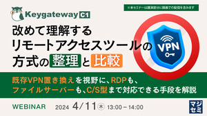 本セミナーでは、改めてリモートアクセスツールの方式について整理をした上で、それぞれの方式を比較します。 また、「脱VPN」を実現し、ファイルサーバーやC/S型システム、さらにRDPにも対応できる接続サービス「KeygatewayC1」のご紹介をします。